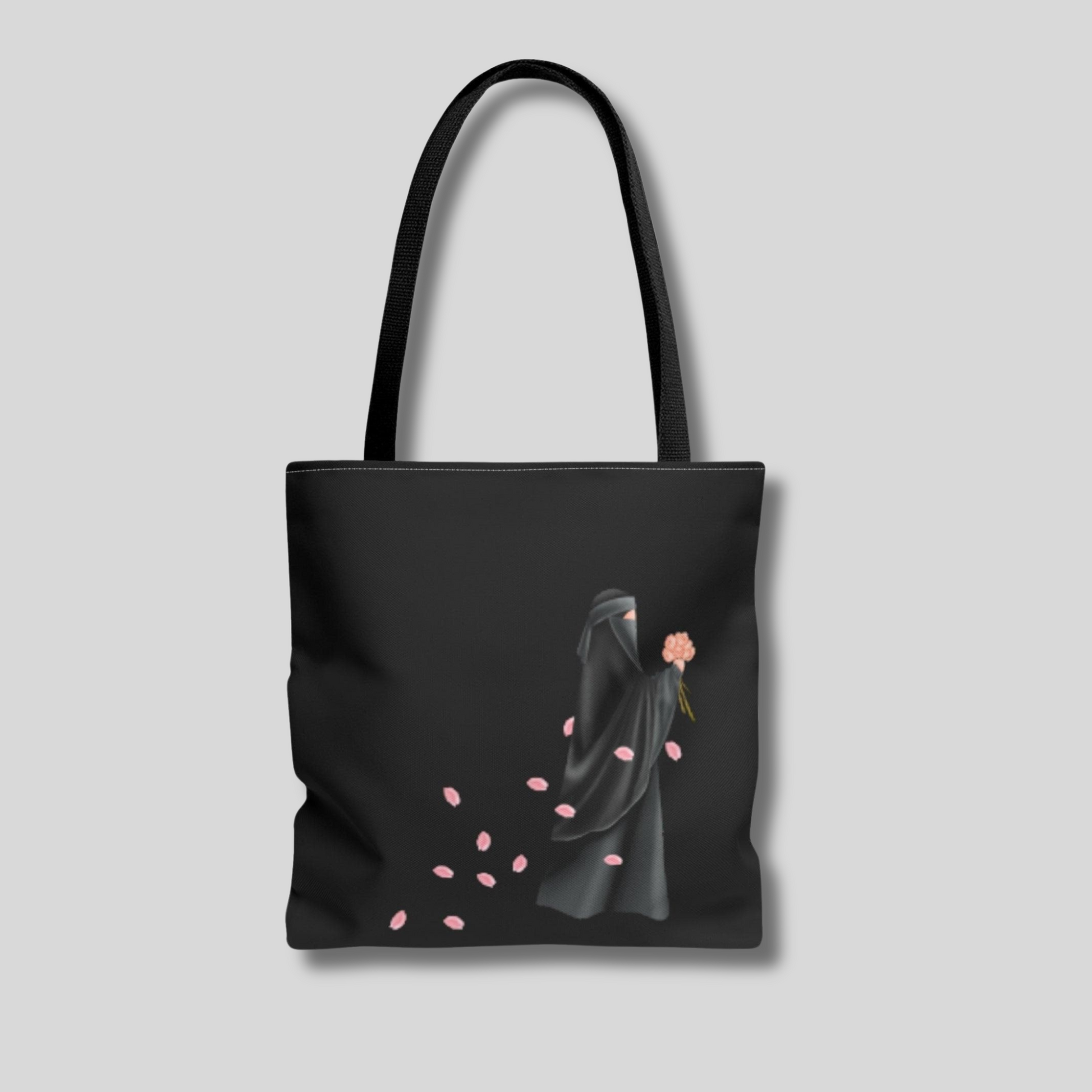 This exclusive tote bag adds the perfect touch of sophistication and elegance to your wardrobe. Featuring a Niqabi woman effortlessly walking with an elegant bouquet of flowers and a trail of petals behind her. This black bag is a beautiful and tasteful piece, perfect for Muslimahs looking to add a luxurious finishing touch to any outfit.